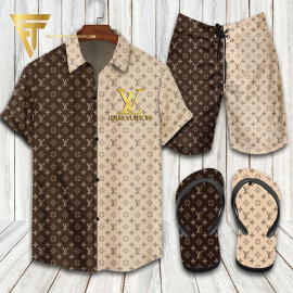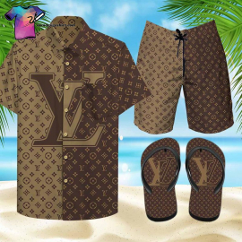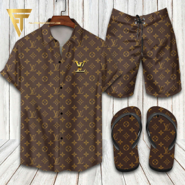 LV2 brown gold logo Hawaiian Shirt And Shorts Or Flip flops QDH
