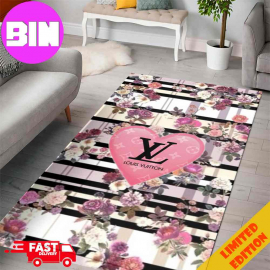 LV2 Rug Carpet NNA Pink Heart Flowers Pattern And Logo Black Luxury Home Decor NNA For Living Room And Bedroom