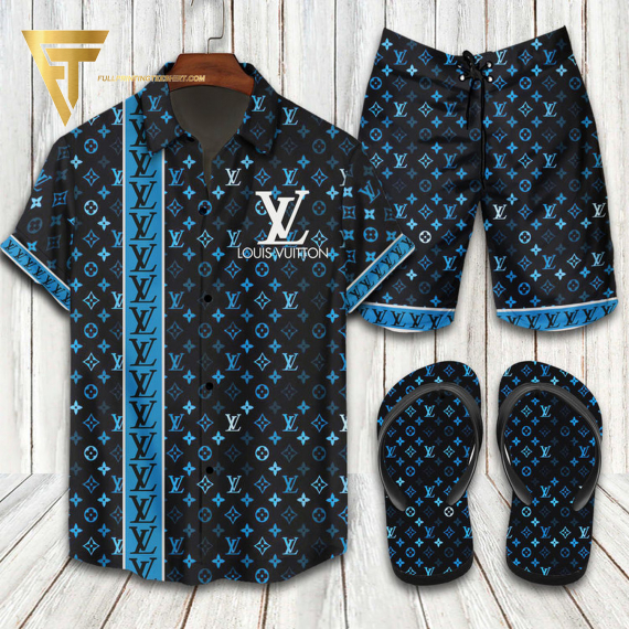 lv2 Black Blue Luxury Brand Hawaiian Shirt And Shorts Or Flip flops HG