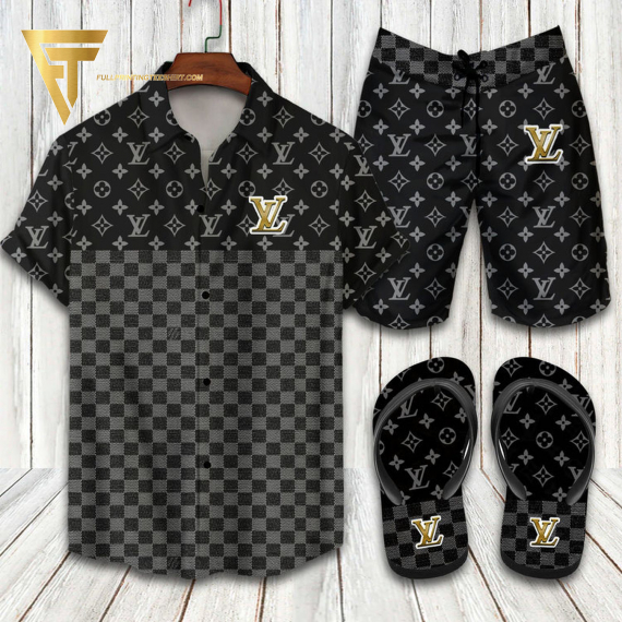 lv2 Black Grey Classic Version Luxury Brand Hawaiian Shirt And Shorts Or Flip flops HG