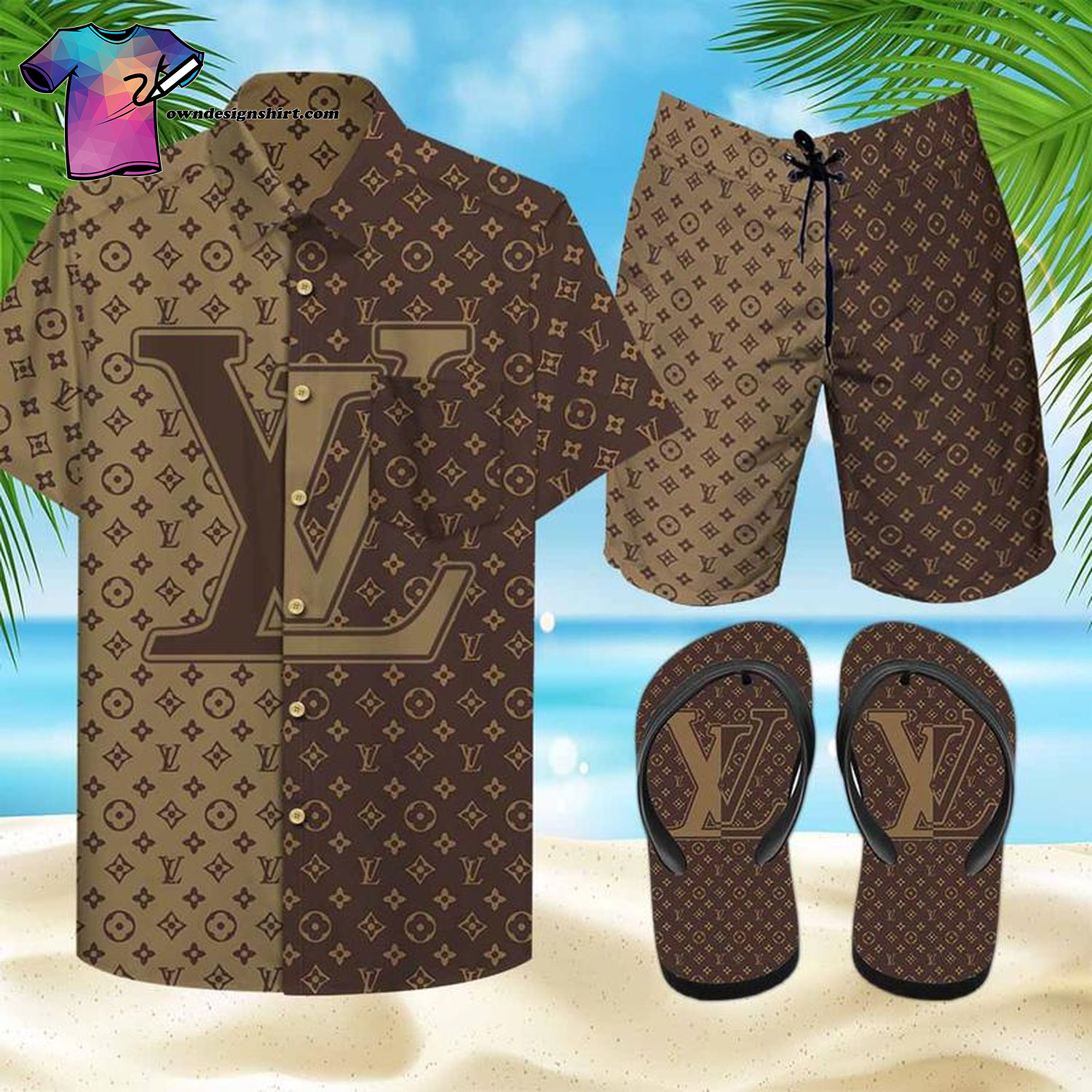 lv2 Brown Classic Logo Full Print Luxury Brand Hawaiian Shirt And Shorts Or Flip flops HG