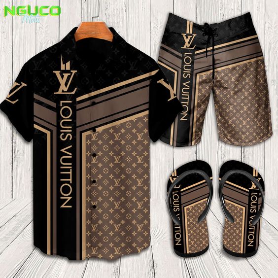 LV2 Brown Hawaii Shirt Shorts Set & Flip Flops LV Luxury Clothing Clothes Outfit For Men HG
